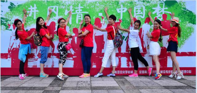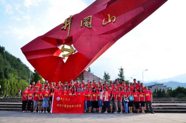图为辅导员们在井冈山党徽下的合影 |