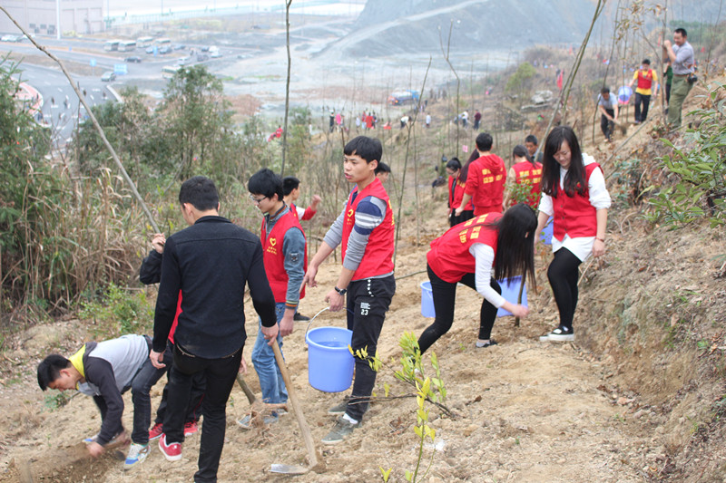 3月7日,志愿者提着水桶、带着锄头来到张家界市荷花机场对面的山坡上,把一棵棵树苗种进土地中,让山坡披上绿意。